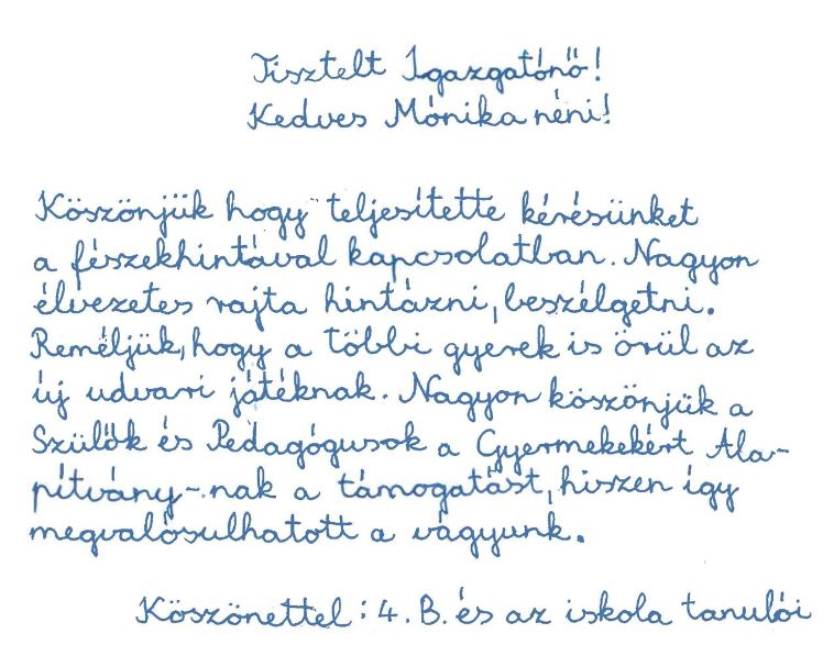 Álomból valóság! Igazgatónőnk a tavalyi év folyamán kapott egy levelet a jelenlegi negyedik B osztályos tanulóktól. A gyerekek egy közös kívánságot fogalmaztak meg: szerettek volna egy fészekhintát az iskola udvarára.Az alapítvány és a szülői munkaközösség összefogásának köszönhetően sikerült előteremteni a szükséges forrást: egy süti vásárt szerveztek, amelynek bevételéből idén megvalósulhatott a terv. A mai napon pedig fel is állították a hintát az udvaron.